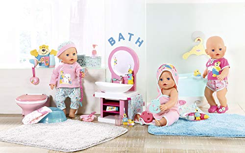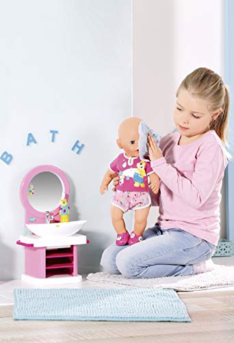 WASTAFEL – Kinderen houden van hun avondroutine, dankzij deze kleurrijke BABY born wastafel; zelfs tandenpoetsen wordt leuk! Druk op de spiegel; hij licht op en maakt geluid.
